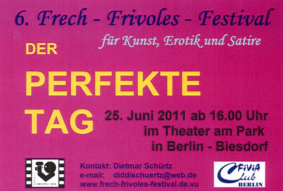 Frech Frivoles Festival - volně přeloženo: Lehce erotický festival. Film je určen pro snímky neprofesionálních filmařů pro které je erotika inspirací k umění - hudební klipy, reportáže, filmy hrané, dokumentární i komedie.